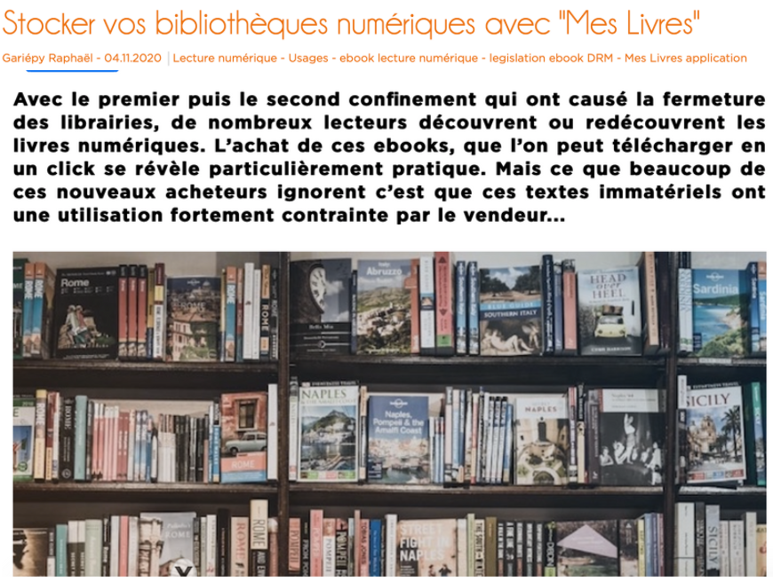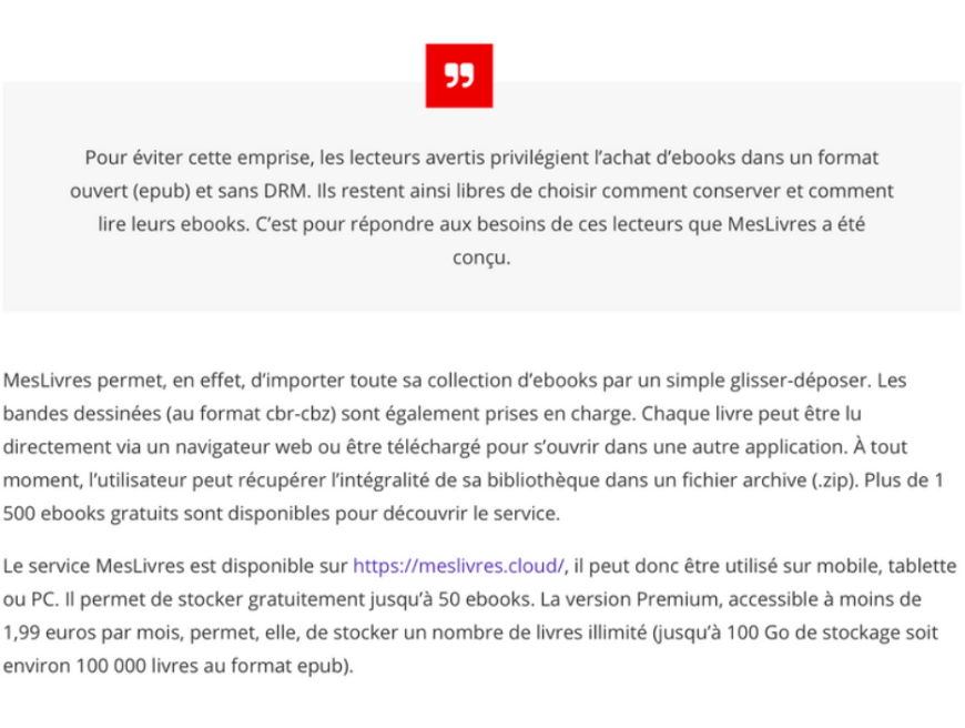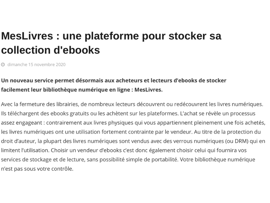 "Un nouveau service permet désormais aux acheteurs et lecteurs d’ebooks de stocker facilement leur bibliothèque numérique en ligne : MesLivres."