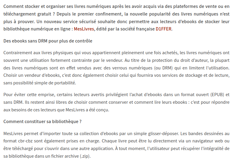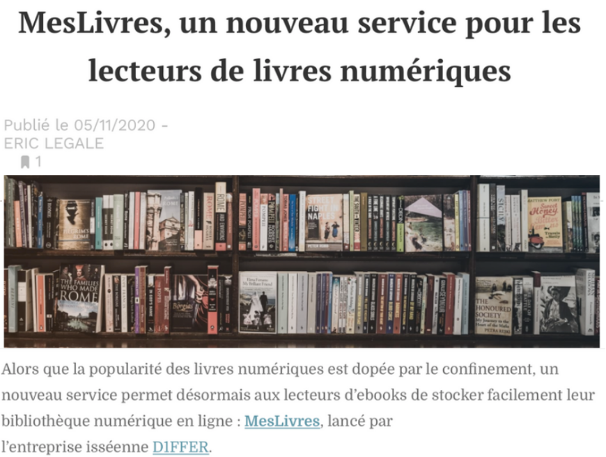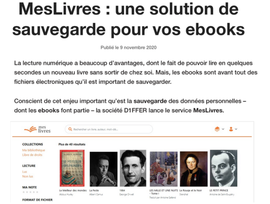 "Conscient de cet enjeu important qu'est la sauvegarde des données personnelles, dont les ebooks font partie, la société D1FFER lance le service MesLivres."